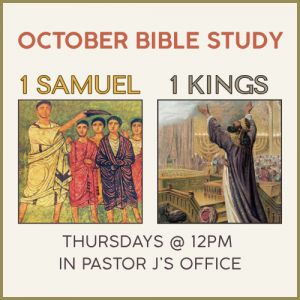 Following the Narrative Lectionary, we will finish up with Exodus, and work through some readings from 1 Samuel and 1 Kings through October. We'll meet in Pastor J's office at noon on Thursdays. Please feel free to bring a lunch...